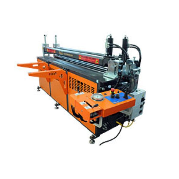The sheets are fixed to the machine body by hydraulic arm; the locking arm has an articulated joint that allws its opening and the easy extraction of the welded sheets.